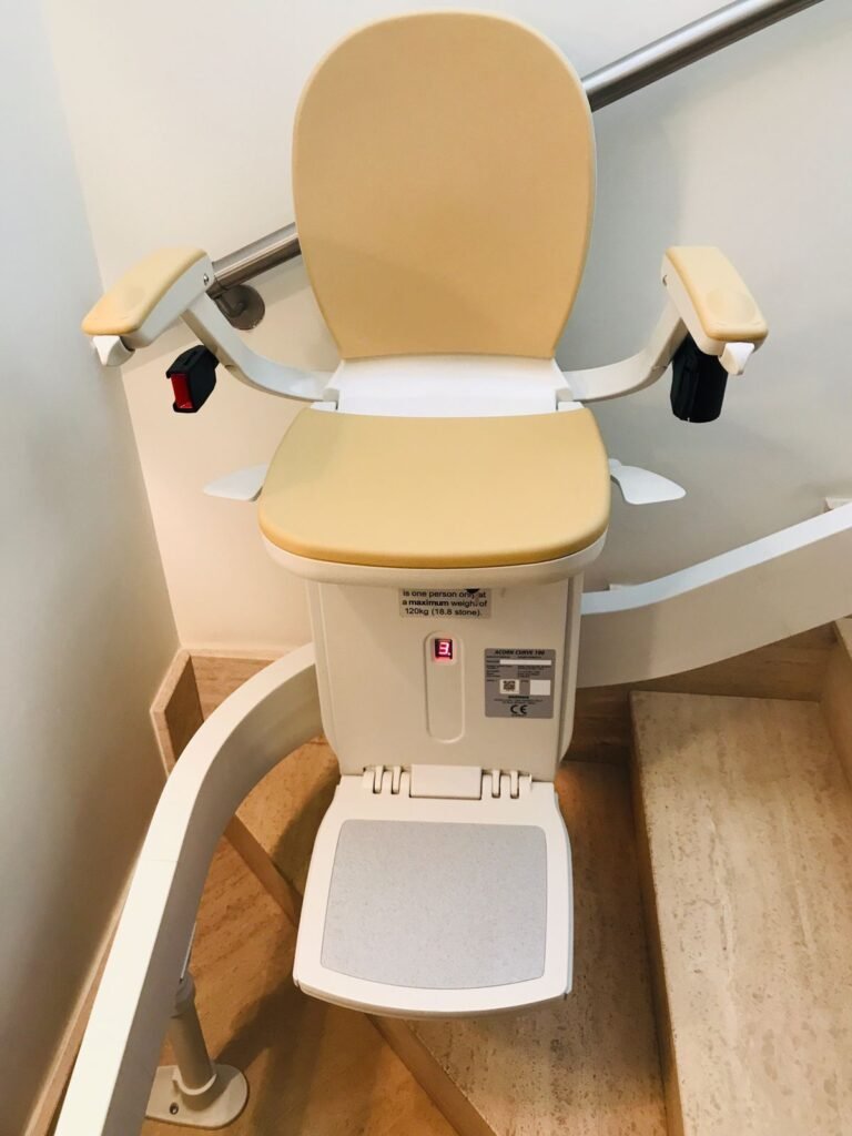 A adaptação consiste na instalação de um trilho sobre a escada, onde a cadeira se desloca suavemente. O processo é rápido e não exige grandes obras.